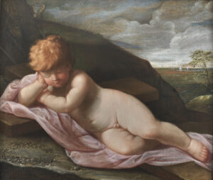 The image of the Infant Jesus sleeping on the Holy Cross with the Crown of Thorns and the Nails aside him is a referent to the love of God. It was probably inspired by a quote of the Cantico dei Cantici. Reni thus created a sense of balance and beauty that would remain distinctive elements in his work.